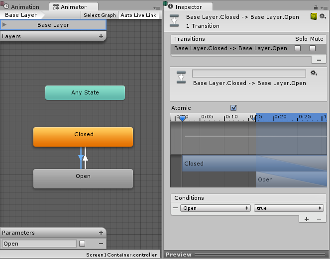 Let’s take a look at the most common and minimal setup for the Animation Controller to do a Screen transition. The controller will need a boolean parameter (Open) and two states (Open and Closed), each state should have an animation with only one keyframe, this way we let the State Machine do the transition blending for us.