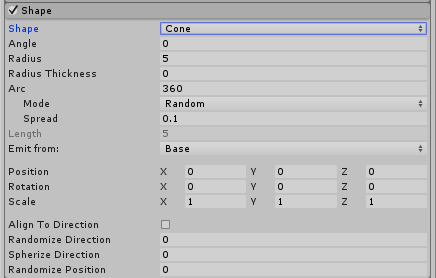 | Spherize Direction | Use a value 0–1, to blend particle directions towards a spherical direction, where they travel outwards from the center of their Transform. When this is set to 0, this setting has no effect. When it is set to 1, the particle direction points outwards from the center (behaving identically to when the Shape is set to Sphere). |
