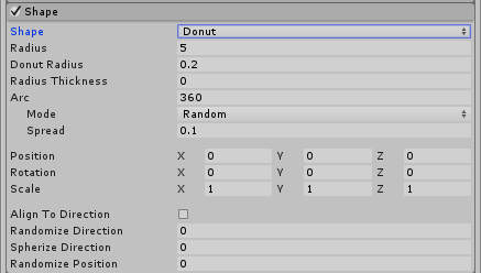 | Mode | Define how particles are generated along the radius of the shape. When set to Random, Unity generates particles randomly along the radius. If using Loop, particles are generated sequentially along the radius of the shape, and loops back to the start at the end of each cycle. Ping-Pong is the same as Loop, except each consecutive loop happens in the opposite direction to the last. Finally, Burst Spread mode distributes particle generation evenly along the radius. This can be used to give you an even spread of particles, compared to the default randomized behavior, where particles may clump together unevenly. Burst Spread is best used with burst emissions. |