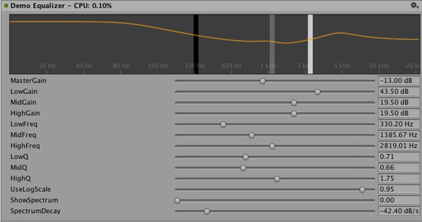 We won’t discuss the details about the DSP processing that is going on in the Equalizer and Multiband plugins here, for those interested, the filters are taken from Robert Bristow Johnson’s excellent Audio EQ Cookbook and to plot the curves Unity provides some internal API functions to draw antialiased curves for the frequency response.