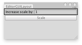 function OnGUI() { sizeMultiplier = EditorGUILayout.FloatField("Increase scale by:", sizeMultiplier); if(GUILayout.Button("Scale")) Selection.activeTransform.localScale = Selection.activeTransform.localScale * sizeMultiplier; } }