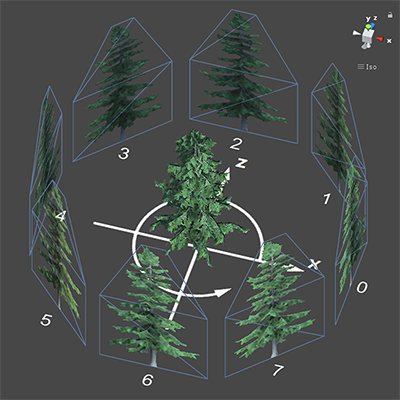 The eight SpeedTree billboard images are baked. The images are created by capturing the rendered image of the 3D tree at different view angles, evenly distributed around the Y-axis. The first image always starts at positive X axis direction (or 0° if you imagine a unit circle from above).