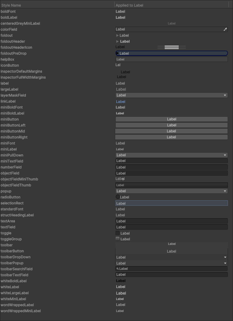 | label | Style used for the labelled on all EditorGUI overloads that take a prefix label. |