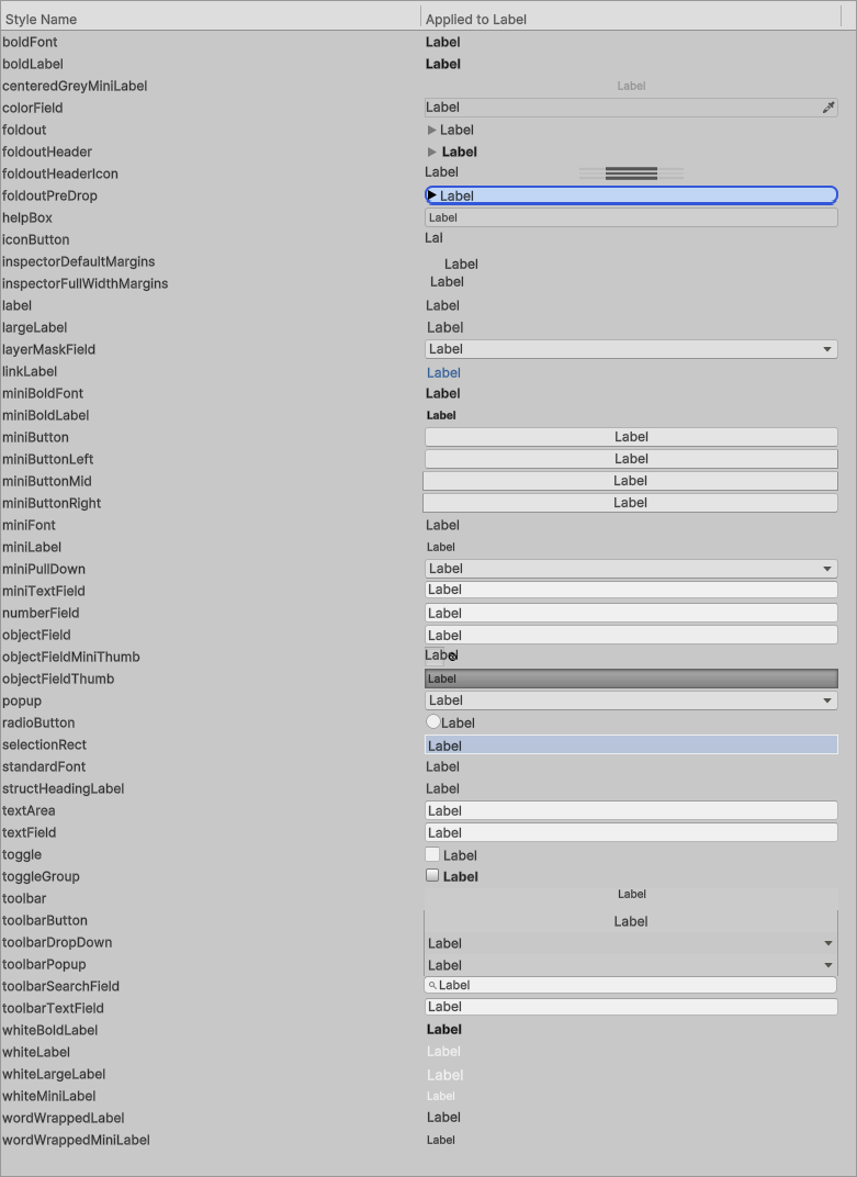| foldoutHeader | Style used for headings for EditorGUILayout.BeginFoldoutHeaderGroup. |