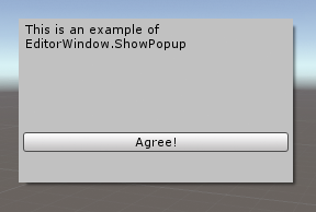 using UnityEngine; using UnityEditor; using UnityEngine.UIElements; public class ShowPopupExample : EditorWindow { [MenuItem("Examples/ShowPopup Example")] static void Init() { ShowPopupExample window = ScriptableObject.CreateInstance<ShowPopupExample>(); window.position = new Rect(Screen.width / 2, Screen.height / 2, 250, 150); window.ShowPopup(); } void CreateGUI() { var label = new Label("This is an example of EditorWindow.ShowPopup"); rootVisualElement.Add(label); var button = new Button(); button.text = "Agree!"; button.clicked += () => this.Close(); rootVisualElement.Add(button); } }