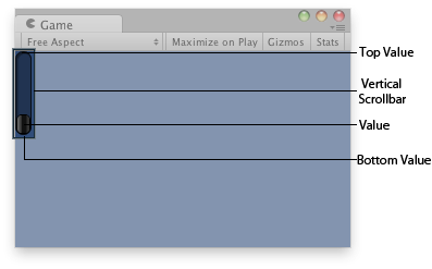 void OnGUI() { vSbarValue = GUILayout.VerticalScrollbar(vSbarValue, 1.0f, 10.0f, 0.0f); } }