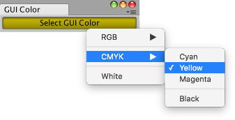 AddMenuItemForColor(menu, "CMYK/Cyan", Color.cyan); AddMenuItemForColor(menu, "CMYK/Yellow", Color.yellow); AddMenuItemForColor(menu, "CMYK/Magenta", Color.magenta); // a trailing slash will nest a separator in a submenu menu.AddSeparator("CMYK/"); AddMenuItemForColor(menu, "CMYK/Black", Color.black);