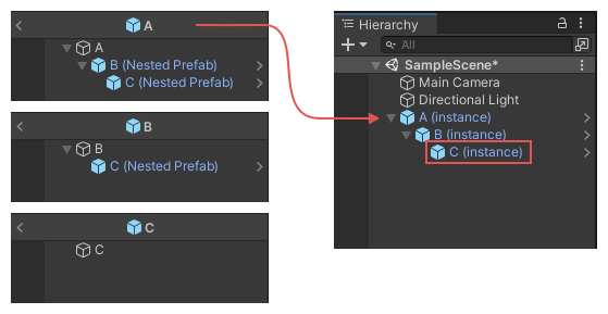 For example, in the diagram shown below, prefab asset A contains a child nested prefab B, which contains a child nested prefab C.
