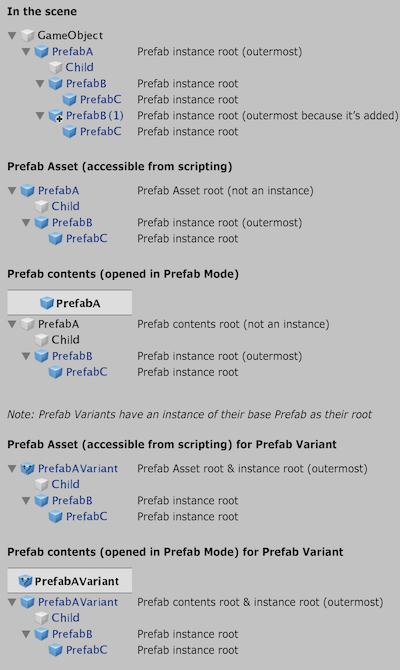 Overview of which objects are Prefab instance roots.