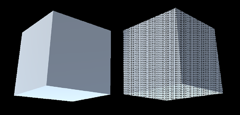 The cube on the right has failed depth testing and might not render in your built application, so Unity highlights the area with INVALIDATED. The cube on the left ignores depth testing and renders correctly.