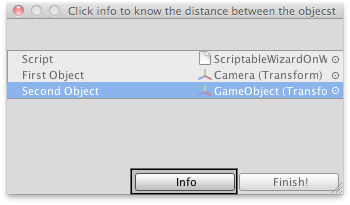 // Called when you press the "Info" button. void OnWizardOtherButton() { float distanceObjs = Vector3.Distance(firstObject.position, secondObject.position); EditorUtility.DisplayDialog( "The distance between the objects is: " + distanceObjs + " Units", "", "OK"); }