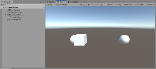 The new parent cube is on the left of the screen and the child sphere is in its original position, next to the parent sphere on the right of the screen.
