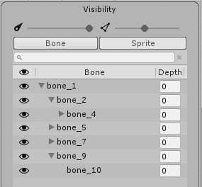Depth | The render order of bones that are influencing the same Sprite Mesh. The parts of the Mesh that is influenced by a bone with higher bone Depth value will overlay the parts influenced by bones with lower Depth value. A bone’s Depth value is 0 by default. To set a bone’s Depth value, select one of the available Bone tools and then select one of the bones. Find the Bone panel at the bottom right of the window, and enter the desired value to its Depth property box. |