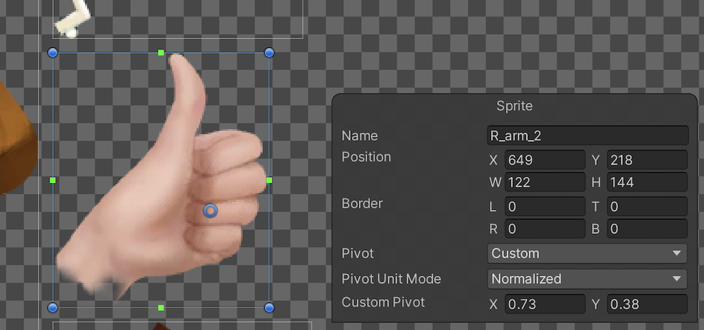 In this example, the two swapped Sprites are aligned by changing the Pivot property from Center to Custom Position, and inputting the Custom Pivot position that aligns the thumbs up Sprite with the open hand Sprite.