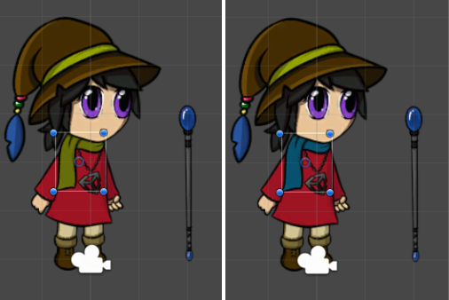 In the following example, there are two Sprites that are variations of the actor’s scarf, with one being green and the other being blue. This workflow demonstrates how to switch from one to the other in the same actor: