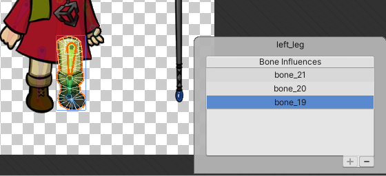 When the Skinning Editor is set to Character mode, the Bone Influences panel allows you to add a bone to the list which includes its influence in the deformation of the selected Sprite’s mesh, or remove a bone from the list which removes its influence instead.