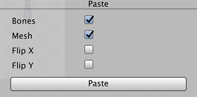 - Mesh, weights, and bone association of source Sprite(s) are pasted to destination Sprite(s) with the same names.