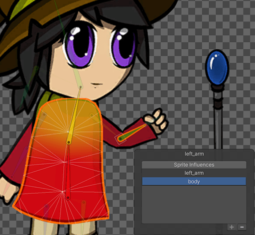 When the Skinning Editor is set to Character mode, the Sprite Influences panel allows you to remove an unwanted Sprite mesh from the list so that it’s not influenced by the selected bone. It’s also possible to add a selected Sprite to the list which will include the selected bone’s influence in its deformation.