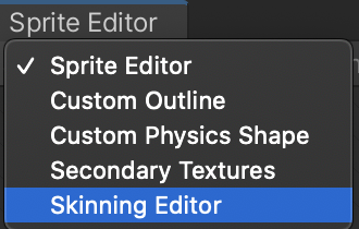 The Skinning Editor is found in the modules drop-down menu at the top left of the Sprite Editor.