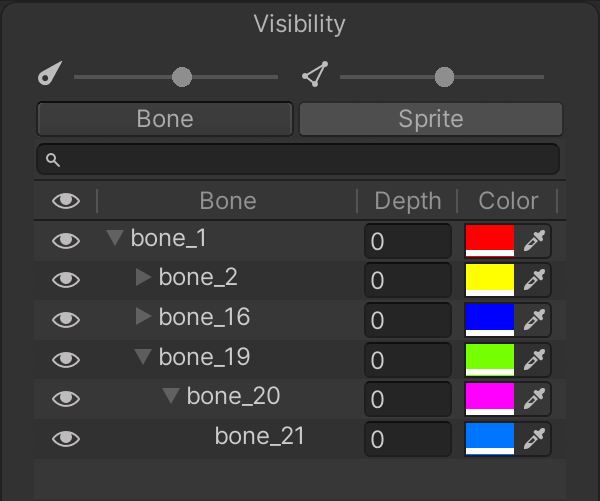 | Depth | Displays the Z-value of bones that are influencing the same Sprite Mesh. The parts of the Mesh that is influenced by a bone with higher Depth value will render in front of the Mesh influenced by bones with lower Depth value. A bone’s Depth value is 0 by default. |