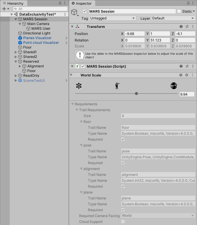 The MARS Session component serves multiple purposes in a MARS Scene. Unity MARS primarily uses the MARS Session component itself to store Scene metadata like the list of required traits, and automatically populates this component based on the traits required by entities in your Scene. As you make changes, the MARS Editor extension analyzes your Scene and adds or removes traits from the Requirements list on the MARS Session. You cannot edit this list.