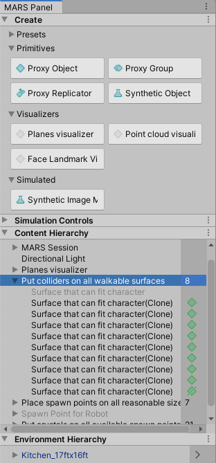 The MARS panel is the main entry point for accessing all Unity MARS capabilities. It is divided into four main sections: Create, Simulation Controls, Content Hierarchy, and Environment Hierarchy.