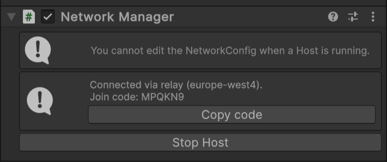 - As a client, use the join code that the host creates to connect to the relay server. This code allows the host and clients to communicate through the relay server without disclosing their IP addresses and ports directly.