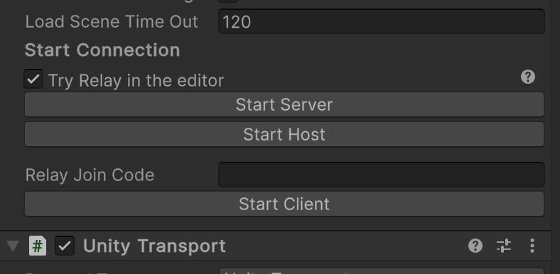 This Relay integration is only available in the Editor, which means you can't use it in a build. Instead, use the code snippets at the end of this page. These snippets use the Unity Transport Package. To do this in projects that don't use Transport, refer to the Relay documentation.