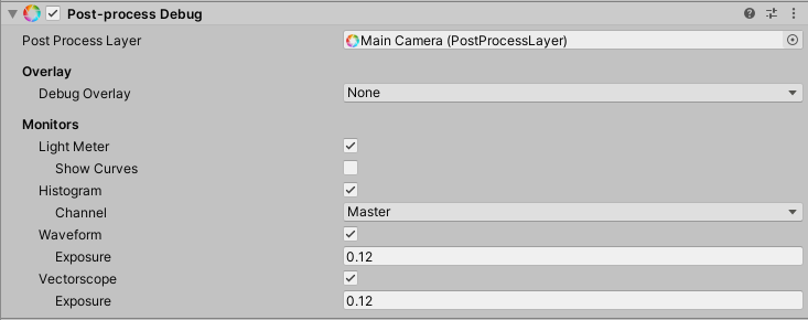 This section describes the settings that the Unity Editor displays in the Inspector for the Post-Process Debug component.