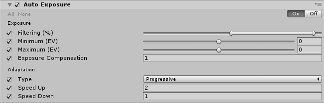 | Type | Select the Adaptation type. Progressive animates the Auto Exposure. Fixed does not animate the Auto Exposure. |