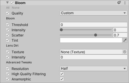| High Quality Filtering | Enable the checkbox to make HDRP use bicubic filtering instead of bilinear filtering. This increases the resource intensity of the Bloom effect, but results in smoother visuals. This property only appears when you enable more options. |
