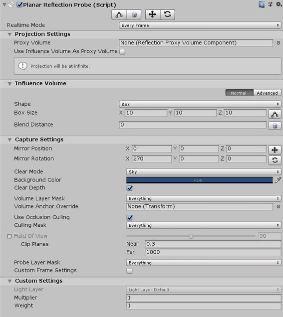 The following properties control the projection settings for this Planar Reflection Probe.