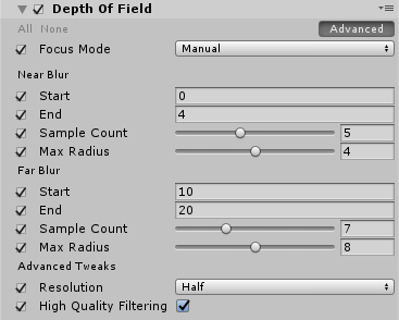 | High Quality Filtering | Enable the checkbox to make HDRP use bicubic filtering instead of bilinear filtering. This increases the resource intensity of the Depth Of Field effect, but results in smoother visuals. This property only appears when you enable the advanced properties. |