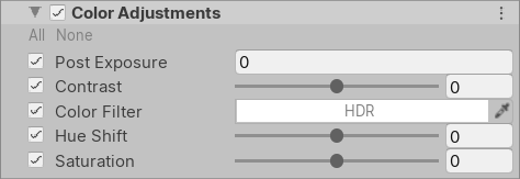 - In the Inspector, navigate to Add Override > Post-processing and click on Color Adjustments. HDRP now applies Color Adjustments to any Camera this Volume affects.