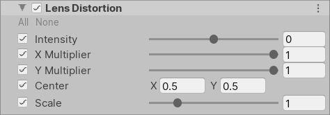 Lens Distortion uses the Volume framework, so to enable and modify Lens Distortion properties, you must add a Lens Distortion override to a Volume in your Scene. To add Lens Distortion to a Volume: