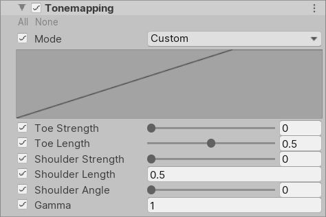 | Mode | Use the drop-down to select a tonemapping algorithm to use for color grading. The options are: • None: Use this option if you do not want to apply tonemapping. • Neutral: Use this option if you only want range-remapping with minimal impact on color hue & saturation. It is generally a great starting point for extensive color grading. • ACES: Use this option to apply a close approximation of the reference ACES tonemapper for a more filmic look. It is more contrasted than Neutral and has an effect on actual color hue & saturation. Note that if you use this tonemapper all the grading operations will be done in the ACES color spaces for optimal precision and results. • Custom: Use this option if you want to specify the tonemapping settings yourself. Selecting this mode exposes properties that allow you to customize the tonemapping curve. • External: Use this option if you want to specify your own lookup table. |