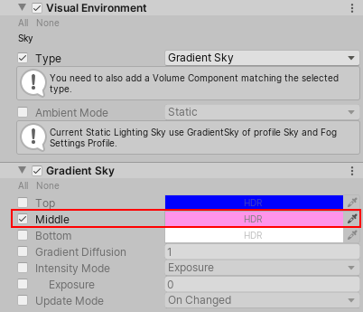 On the Gradient Sky override itself, you can enable the checkboxes next to each property to override the property with your own values. For example, enable the checkbox next to the Middle property and use the color picker to change the color to pink.