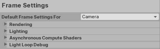Default Frame Settings For is not just the title of the section, it also corresponds to the drop-down menu, to its right, that allows you to select which component to change the default Frame Settings for. Before you change any Frame Settings, select a component from the drop-down menu. The options are Camera, Baked or Custom Reflection, and Realtime Reflection. After you select a component, you can change the default settings HDRP uses to render a frame using that component. To make Cameras and Reflection Probes use their respective default Frame Settings, disable the Custom Frame Settings checkbox under the General settings of Cameras or under Capture Settings of Reflection Probes.