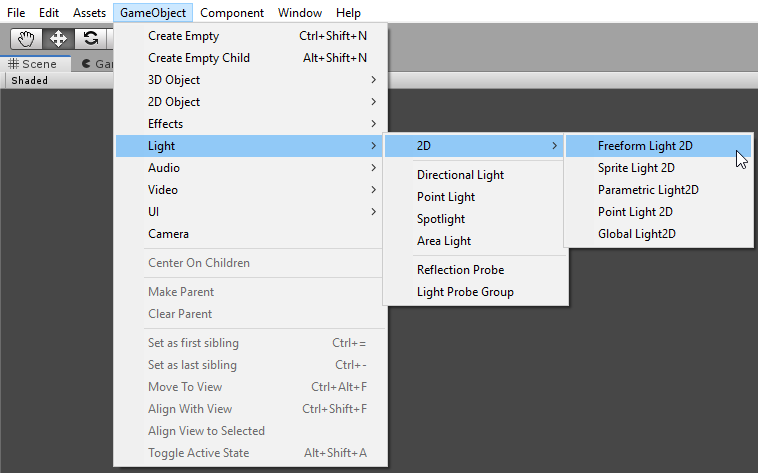 You can choose from several different light types with the Light 2D component. The light types currently available in the package are: