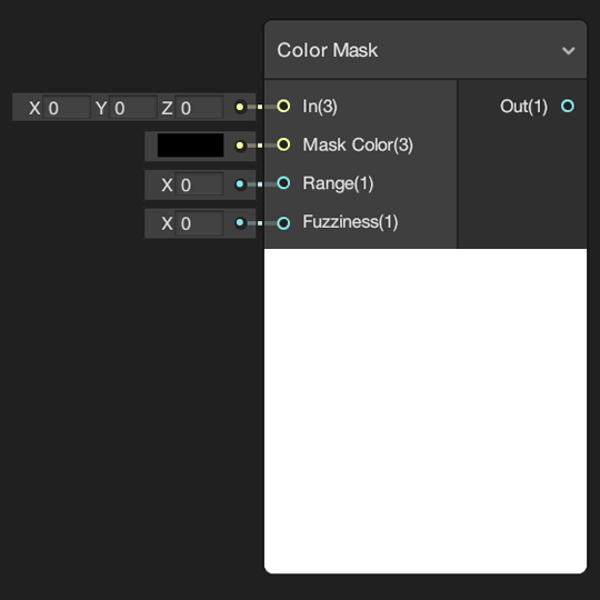 | Masks values of input In on channels selected in dropdown Channels. | Creates a mask from values in input In equal to input Mask Color. |