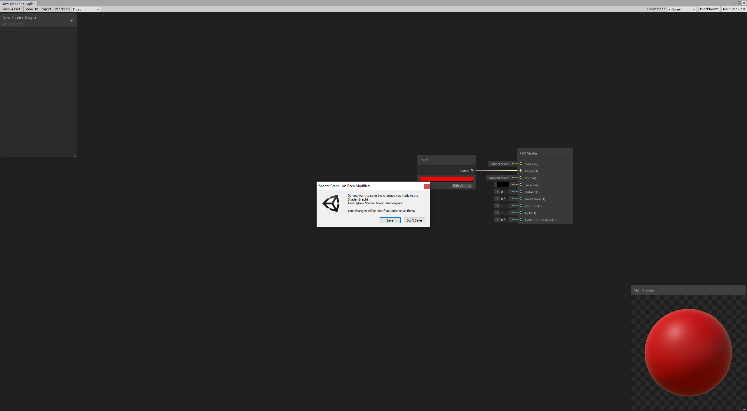 - Close the graph. If Unity detects any unsaved changes, a pop-up window appears, and asks if you want to save those changes.