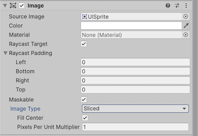 An Image has a Rect Transform component and an Image component. A sprite can be applied to the Image component under the Target Graphic field, and its colour can be set in the Color field. A material can also be applied to the Image component. The Image Type field defines how the applied sprite will appear, the options are:
