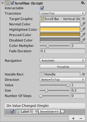 | On Value Changed | A UnityEvent that is invoked when the current value of the Scrollbar changes. The event can send the value as a float type dynamic argument. |