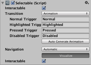 | Animation | Allows animations to occur depending on the state of the button, an animator component must exist in order to use animation transition. It’s important to make sure root motion is disabled. To create an animation controller click on generate animation (or create your own) and make sure that an animation controller has been added to the animator component of the button. |
