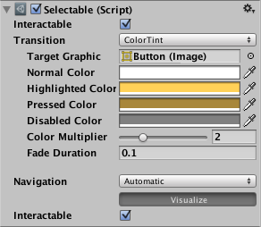 Within a selectable component there are several transition options depending on what state the selectable is currently in. The different states are: normal, highlighted, pressed and disabled.