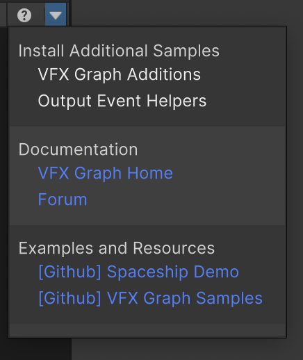 Toggle: Opens the Visual Effect Graph manual. Dropdown: VFX Graph Additions: Installs pre-made visual effects and utility operators made with Visual Effect Graph. These include Bonfire, Lightning, Smoke and Sparks effect examples. There are also various operators and Subgraph Blocks: • Get Strip Progress: A subgraph that calculates the progress of a particle in the strip in the range 0 to 1. You can use this to sample curves and gradients to modify the strip based on its progress. • Encompass (Point): A subgraph that grows the bounds of an AABox to encompass a point. • Degrees to Radians and Radians to Degrees: Subgraphs that help you to convert between radians and degrees within your graph. Output Event Helpers: This version of the Visual Effect Graph introduces new helper scripts to the OutputEvent Helpers sample to help you to set up OutputEvents: • Cinemachine Camera Shake: An Output Event Handler script that triggers a Camera shake through a Cinemachine Impulse Source, on a given output event. • Play audio: An Output Event Handler script that plays a single AudioSource on a given output event. • Spawn a Prefab: An Output Event Handler script that spawns Prefabs (managed from a pool) on a given output event. It uses position, angle, scale, and lifetime to position the Prefab and disable it after a delay. To synchronize other values, you can use other scripts inside the Prefab: • Change Prefab Light: An example that demonstrates how to synchronize a light with your effect. • Change Prefab RigidBody Velocity: An example that demonstrates how to synchronize changing the velocity of a RigidBody with your effect. • RigidBody: An Output Event Handler script that applies a force or velocity change to a RigidBody on a given output event. • Unity Event: An Output Event Handler that raises a UnityEvent on a given output event. • VFX Graph Home: Opens the Visual Effect Graph home page. • Forum: Opens a Visual Effect Graph sub-forum. • [Github] Spaceship Demo: Opens a repository of AAA Playable First person demo showcasing effects made with Visual Effect Graph and rendered with the High Definition Render Pipeline. • [Github] VFX Graph Samples: Opens a repository that contains sample scenes and visual effects made with Visual Effect Graph. |