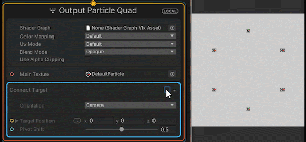 The Connect Target Block scales and orients particles so they connect to a specified target position.