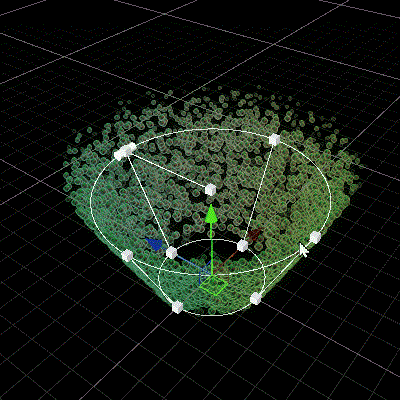 This Block also calculates a direction vector based on the calculated position on the shape, and stores it to the direction attribute, based on composition. This direction is equal to the normalized vector from the center of the cone to the calculated position.