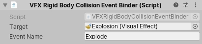 The Rigid Body Collision Event Binder triggers an Event in the target Visual Effect every time something collides with the Rigidbody attached to the same GameObject as this component. This binder also attaches the collision world position to the position EventAttribute, and the contact Normal to the velocity EventAttribute.