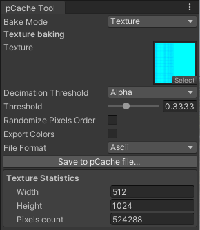 Depending on which mode you select, the window displays different properties to control the baking process. After you specify the input Mesh/Texture2D and set up the properties, click Save to pCache file… to bake the Point Cache and save the result to a Point Cache asset.